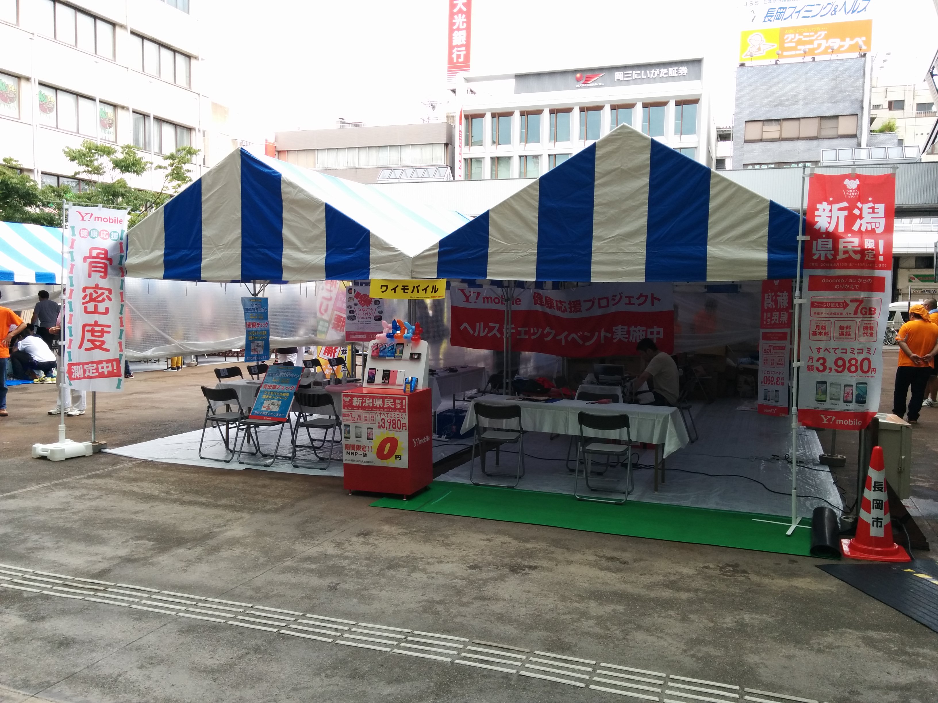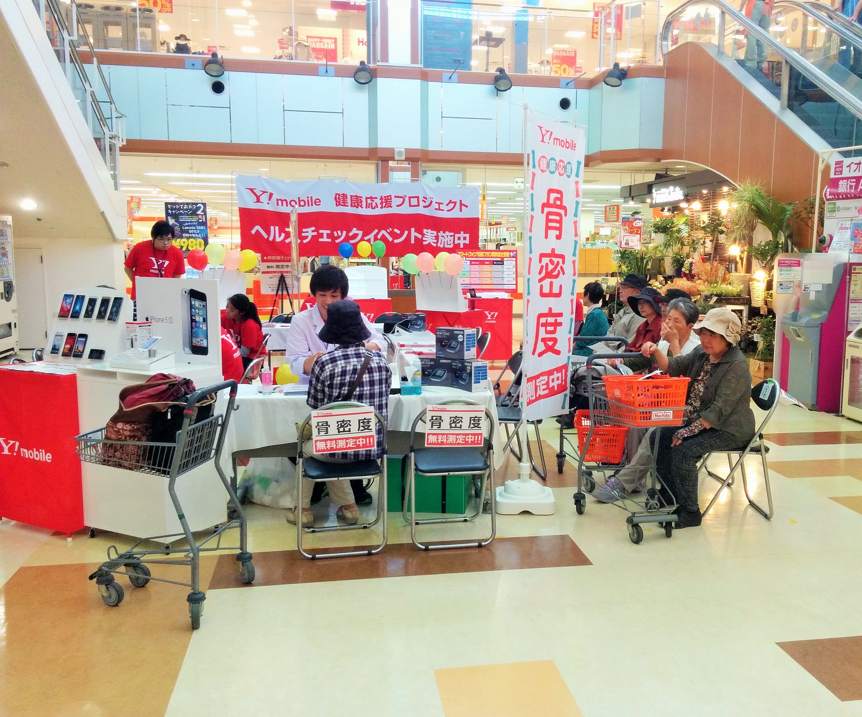 悪天候の中でも健康チェックへご参加いただくお客様は多く、また携帯ショップのPRも便利になって良かったと喜んでいただけた開催となりました。