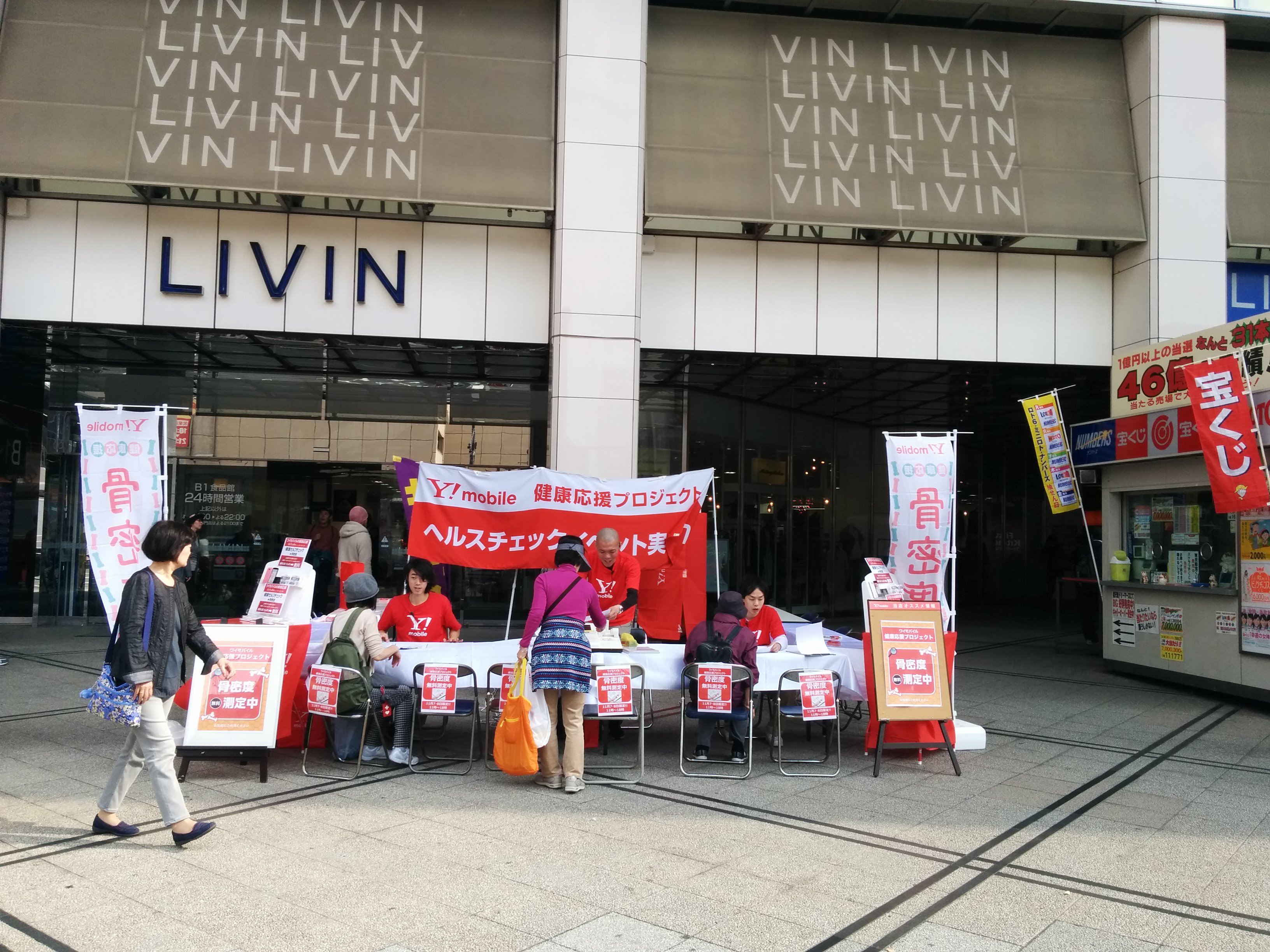 ららぽーとTOKYO-BAYのデッキにて、健康チェックと携帯ショップPRを行い、216組のお客様へご参加いただきました。
