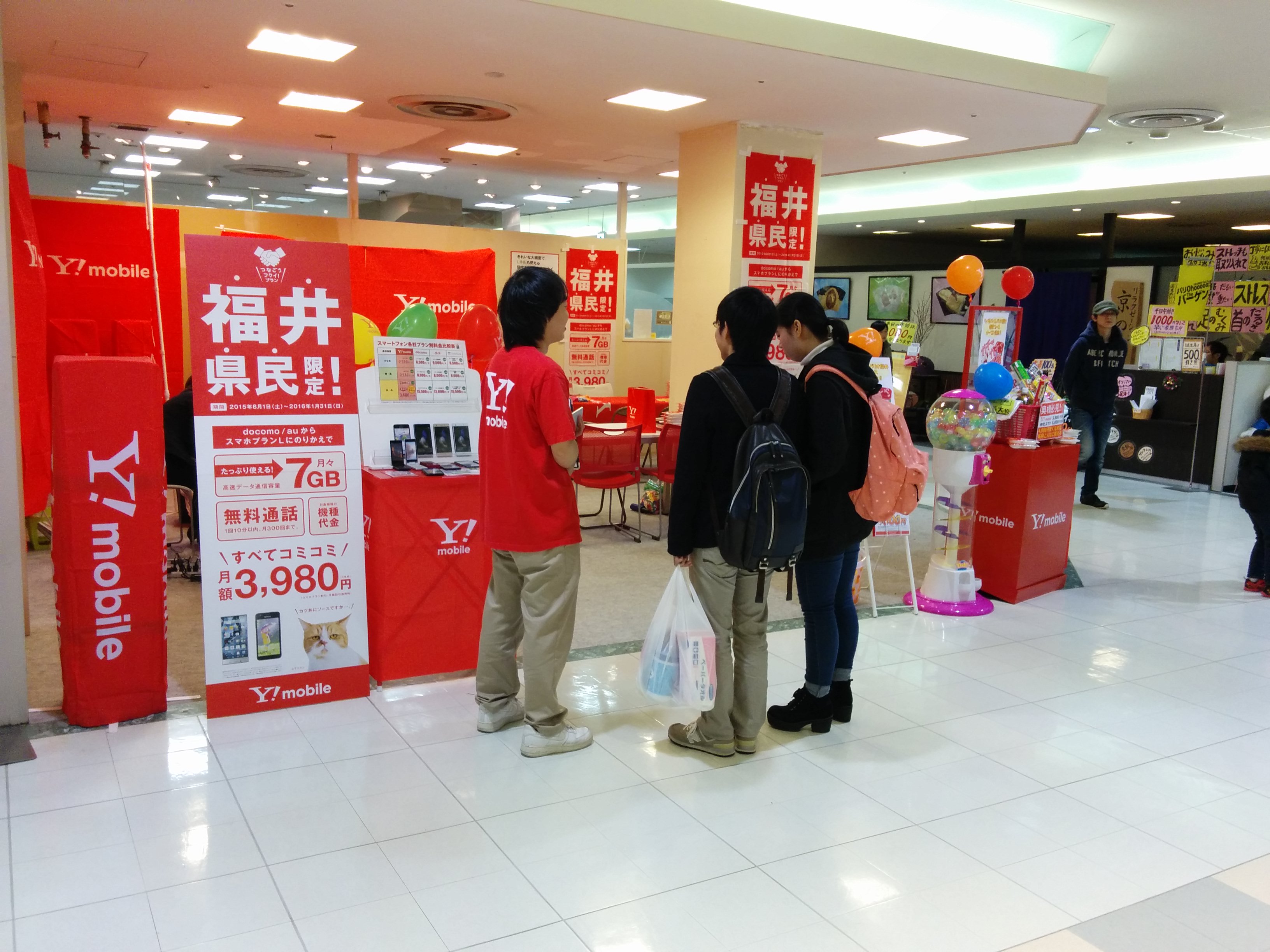 アルプラザ・ベルの中へ携帯ショップのブースを出展。『つなごう!福井プロジェクト』というコンセプトのもと、福井県在住の方へ向けた内容にてPRを行いました。