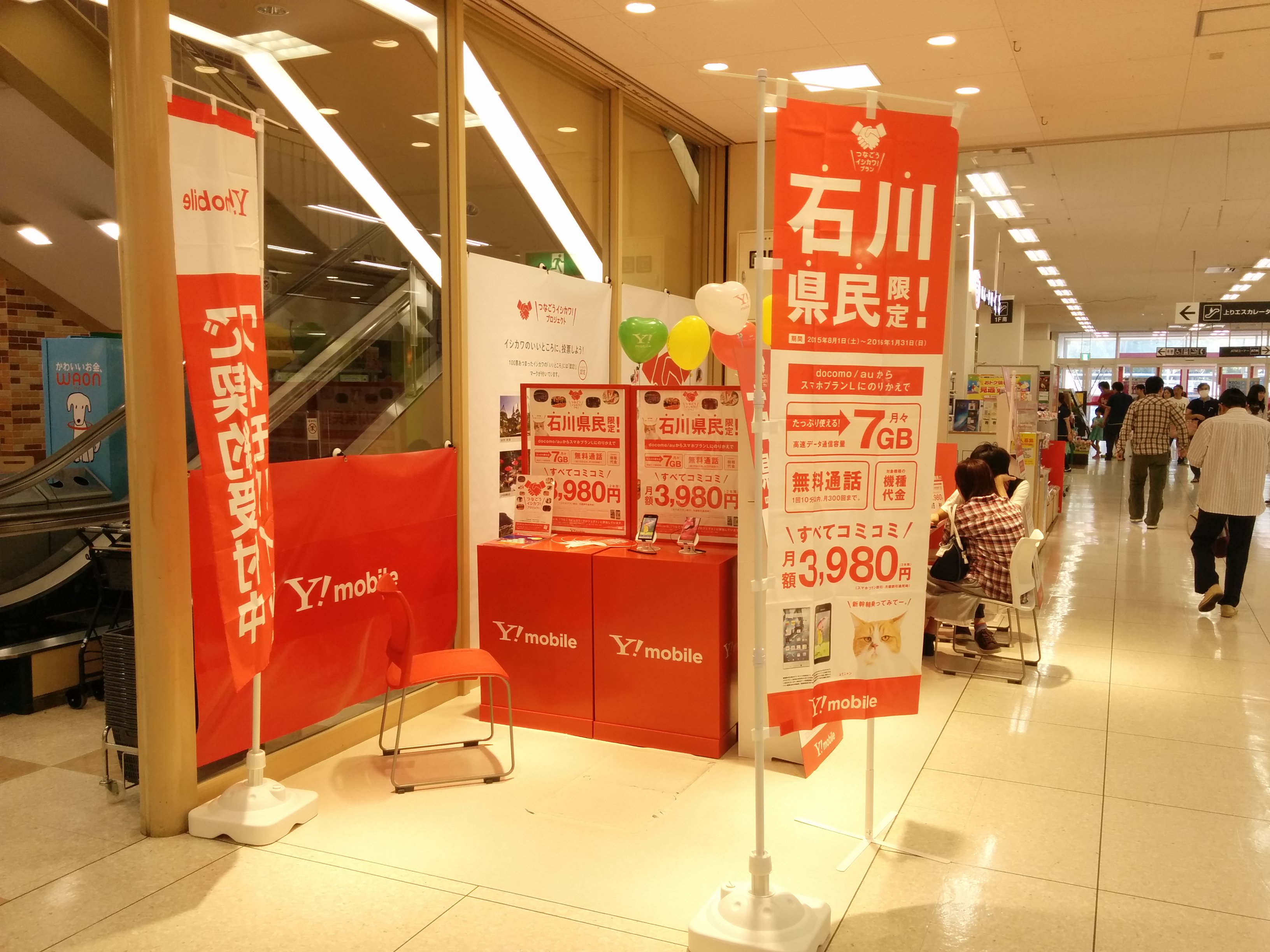 イオンの中へ携帯ショップのブースを出展。『つなごう!石川プロジェクト』というコンセプトのもと、石川県在住の方へ向けた内容にてPRを行いました。